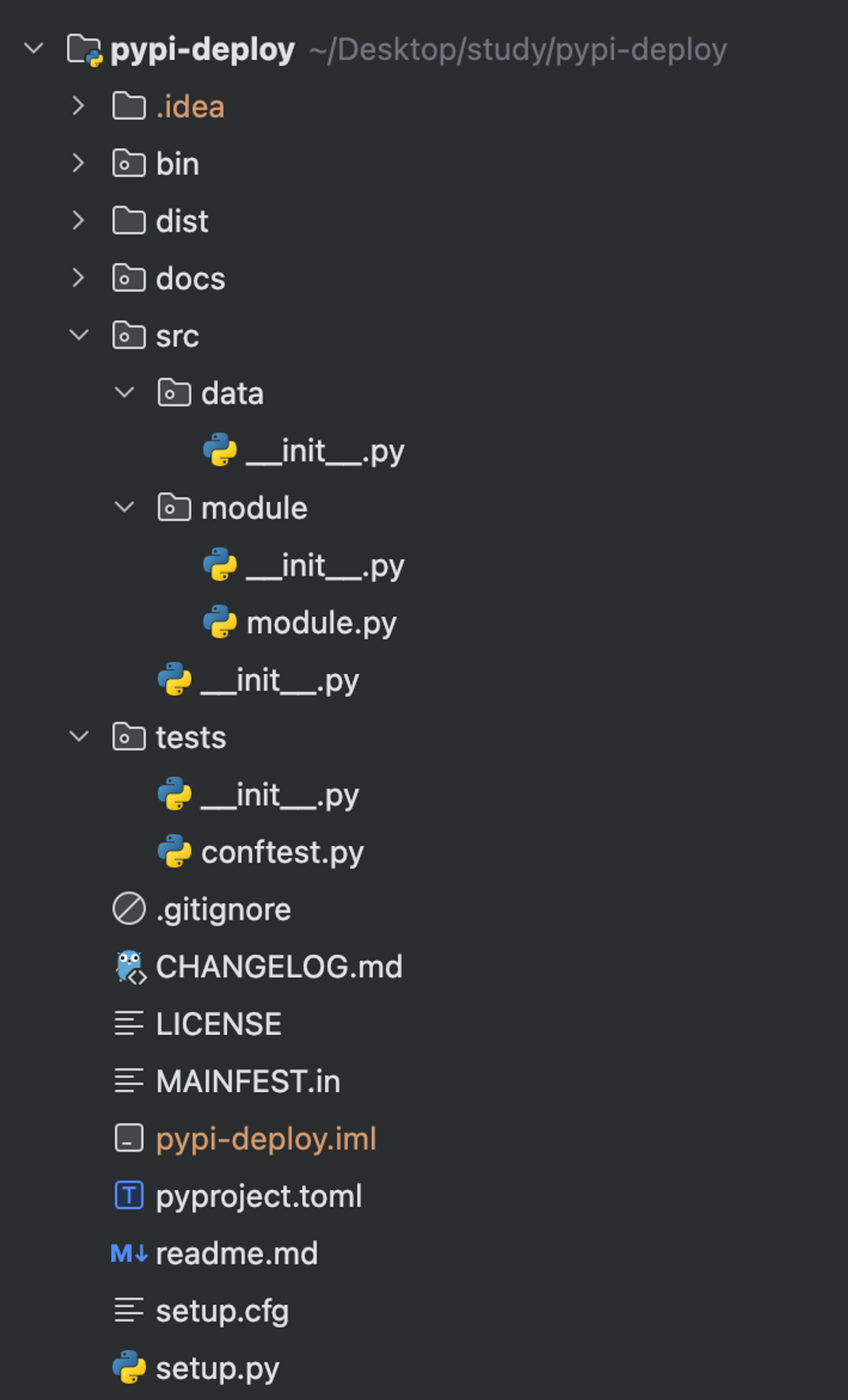 pip를 이용하여 설치하는 패키지는 모두 pypi에 존재하는 패키지이며, 아래와 같이 구조를 구성하여 배포할 수 있습니다.
